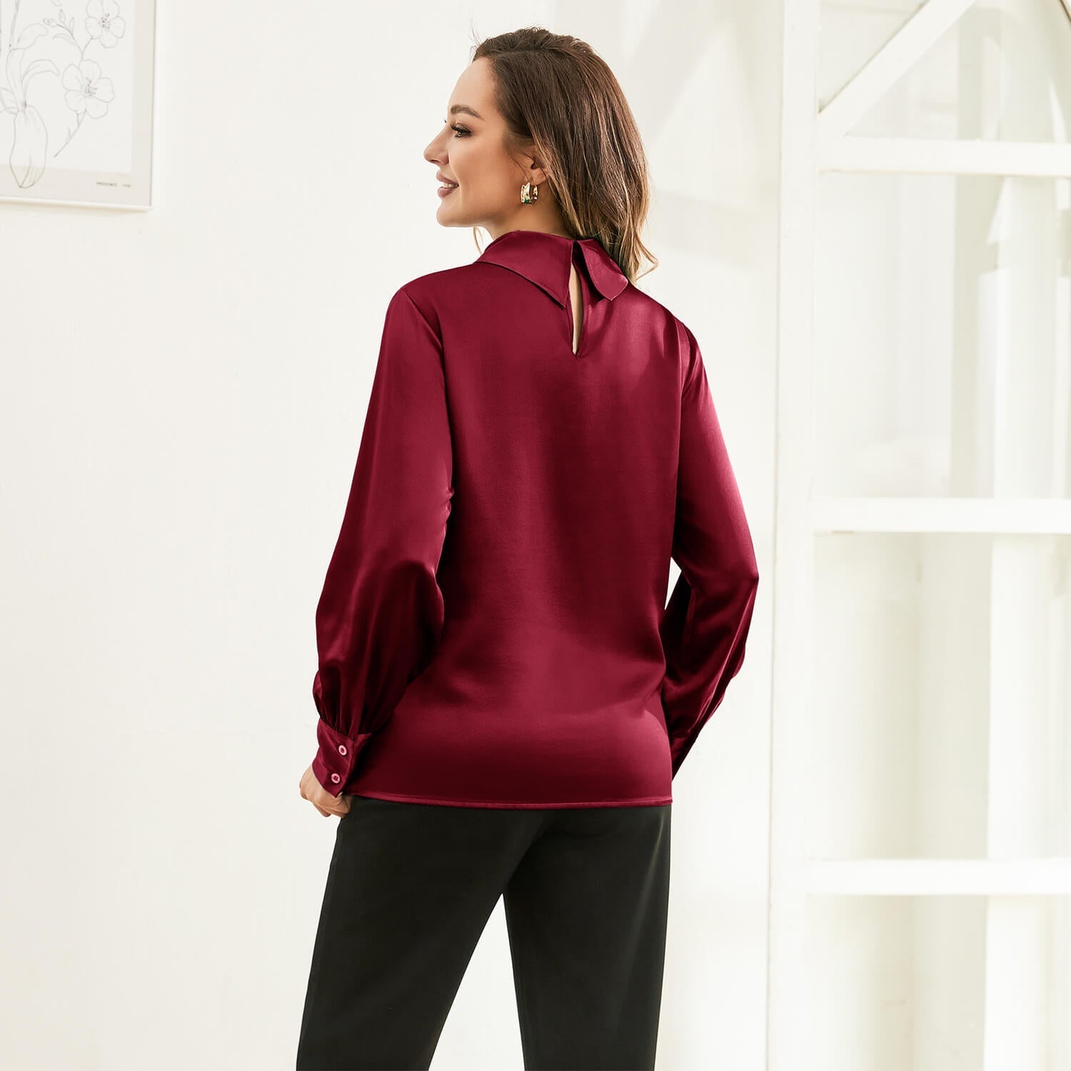 Exude refined elegance with this silk mock neck blouse, a perfect blend of luxury and sophistication. Crafted from 100% silk, this blouse features a sleek high neckline that enhances its polished aesthetic. The long sleeves with gathered cuffs create a graceful, flowing silhouette, making it an ideal choice for both professional and evening wear.