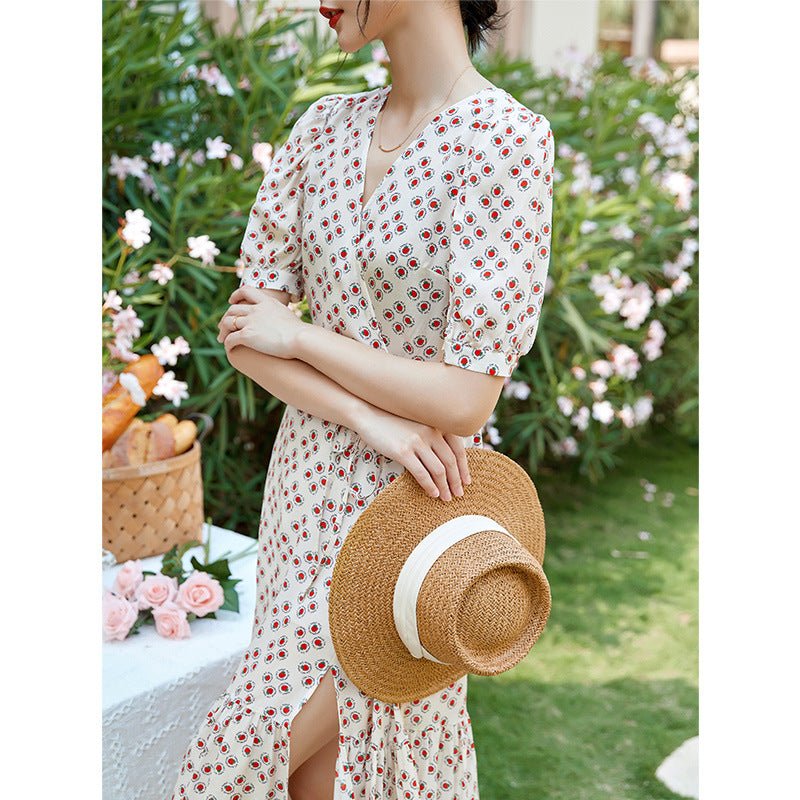 Playful yet elegant, this silk midi dress features a flattering wrap-style bodice, short puff sleeves, and a self-tie waist for a cinched silhouette. Adorned with a charming allover print, the dress is finished with a subtle front slit and ruffle-trimmed hem for added flair. Perfect for garden gatherings, weekend dates, or summer strolls.